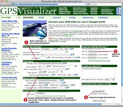 Goto the Google Earth mapping page on GPS Visualizer website. Once there fill out the form as per the guide image below. You can adjust various settings to influence the look in Google Earth.