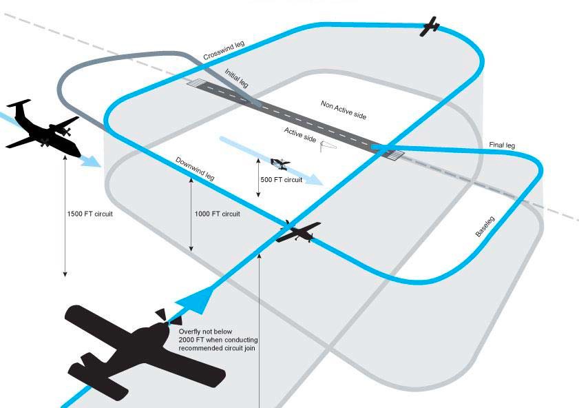 There are many aerodromes where the runway in use can be established before arrival and overflying isn’t required. In these cases you can arrive and join the circuit directly without doing the overfly. The preferred method is to join at 45 degrees to the downwind leg. However you may often approach the airfield from the opposite site so doing so is not possible. The rules don’t stop you joining the circuit from crosswind, downwind, base or final. However base and final are least preferred. The diagram to the right here (also take from the CASA document) shows the circuit entry approaches. Basically it comes down to safety, so straight in final approaches are the least safest approach when other aircraft are already in the circuit.